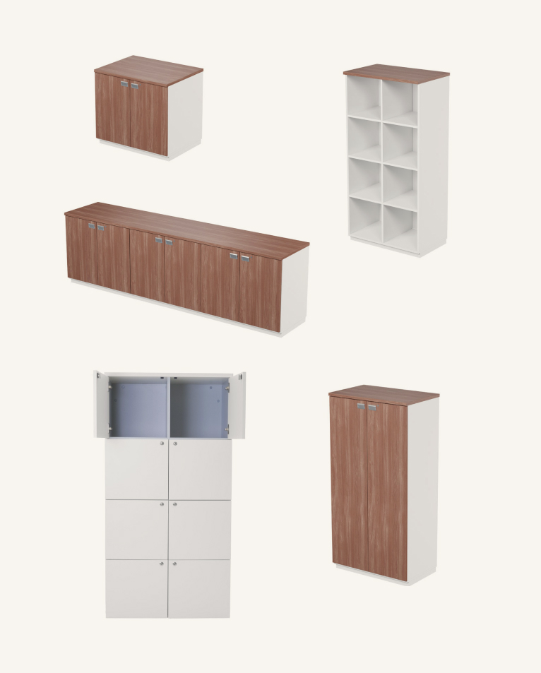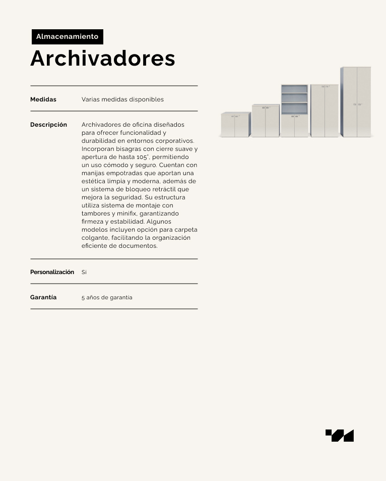 Archivadores de oficina diseñados para ofrecer funcionalidad y durabilidad en entornos corporativos. Incorporan bisagras con cierre suave y apertura de hasta 105°, permitiendo un uso cómodo y seguro. Cuentan con manijas empotradas que aportan una estética limpia y moderna, además de un sistema de bloqueo retráctil que mejora la seguridad. Su estructura utiliza sistema de montaje con tambores y minifix, garantizando firmeza y estabilidad. Algunos modelos incluyen opción para carpeta colgante, facilitando la organización eficiente de documentos.