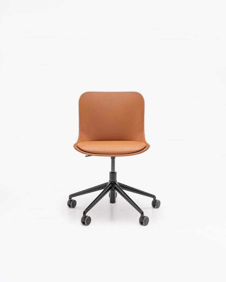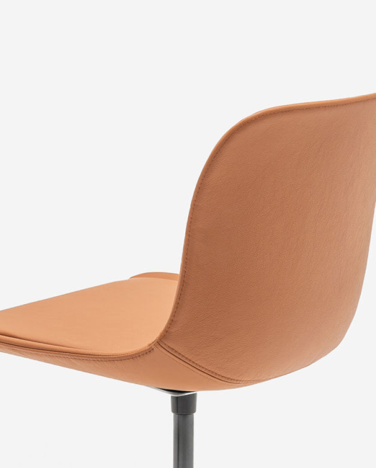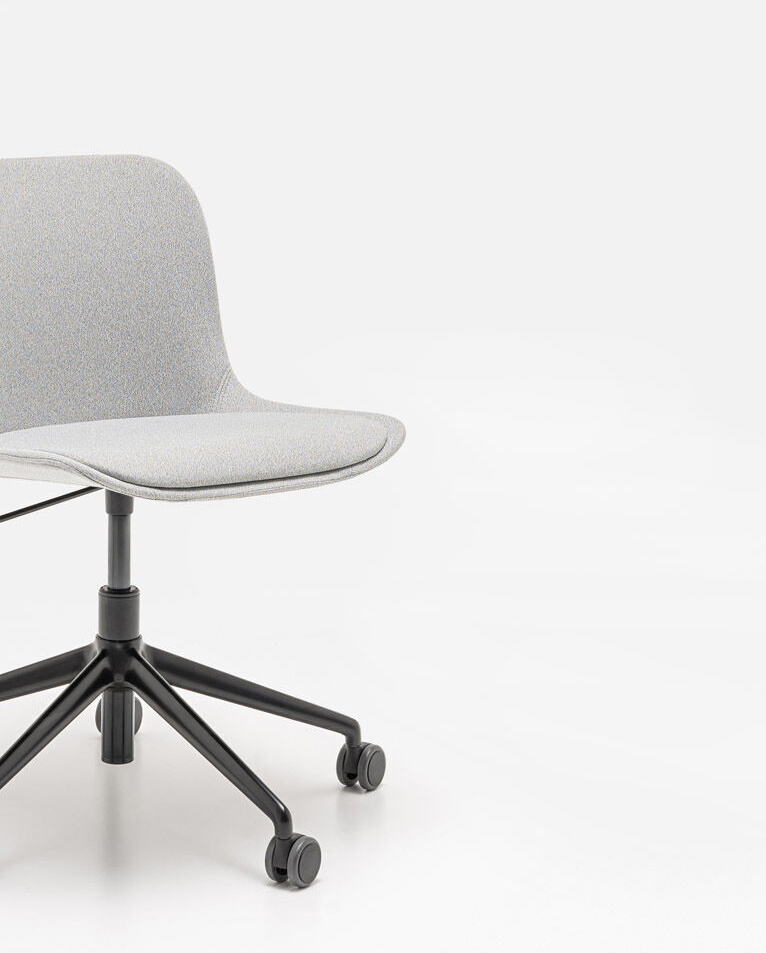 Asiento con carcasa de polipropileno tapizado y cojín de espuma suave. Base giratoria de aluminio, con opción de ajustar la altura del asiento. Telas de alta calidad, algunas provenientes de reciclaje post-consumo. Materiales fácilmente reciclables. Diseñada para oficinas, así como para estaciones de trabajo y estudio en el hogar.