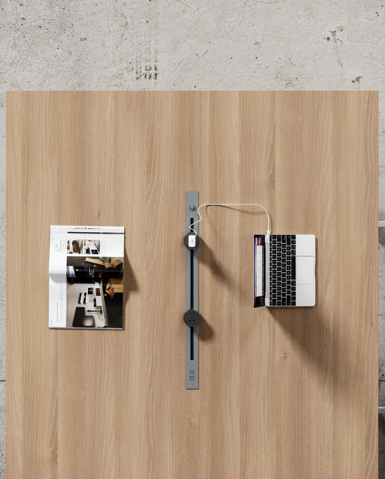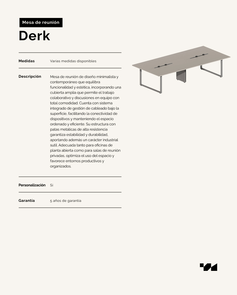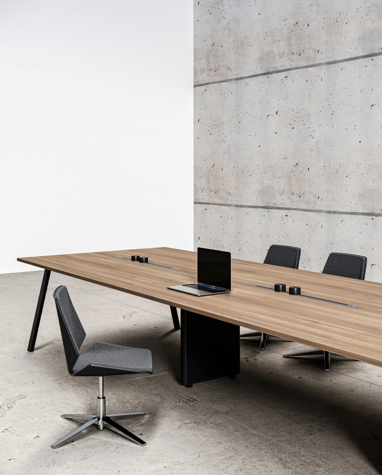 Mesa de reunión de diseño minimalista y contemporáneo que equilibra funcionalidad y estética, incorporando una cubierta amplia que permite el trabajo colaborativo y discusiones en equipo con total comodidad. Cuenta con sistema integrado de gestión de cableado bajo la superficie, facilitando la conectividad de dispositivos y manteniendo el espacio ordenado y eficiente. Su estructura con patas metálicas de alta resistencia garantiza estabilidad y durabilidad, aportando además un carácter industrial sutil. Adecuada tanto para oficinas de planta abierta como para salas de reunión privadas, optimiza el uso del espacio y favorece entornos productivos y organizados.