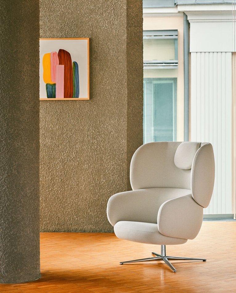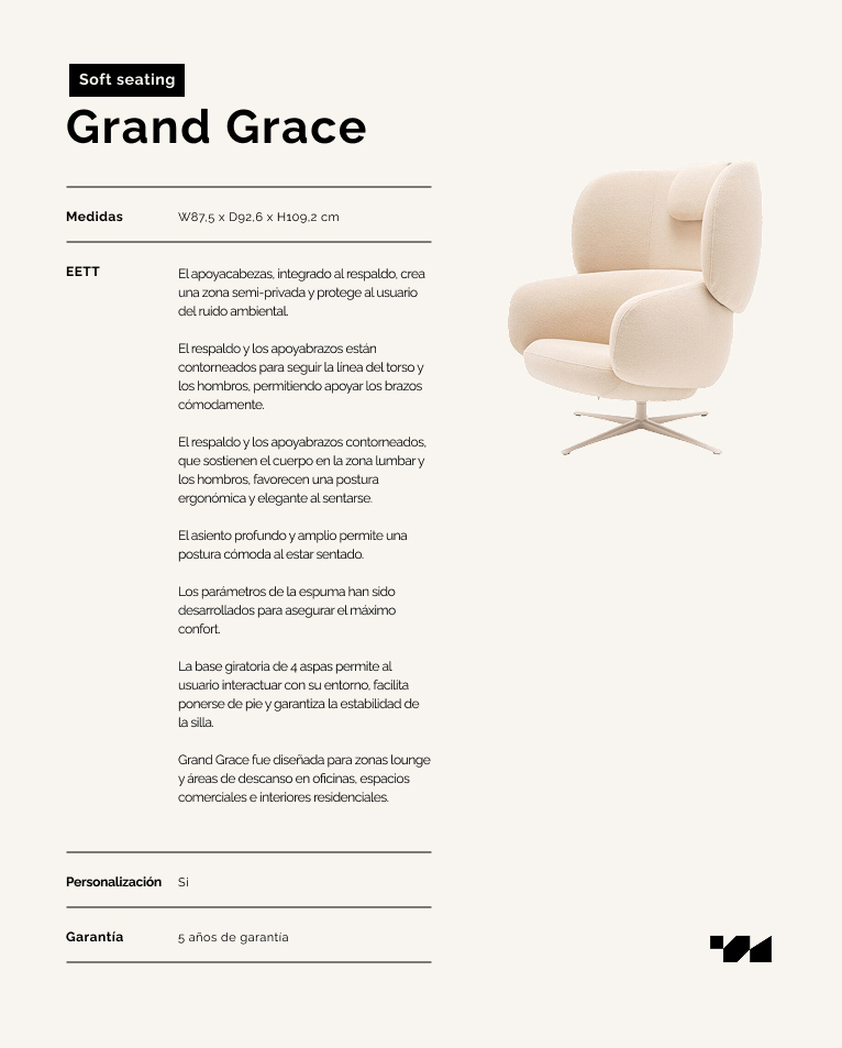 Grand Grace fue diseñada para zonas lounge y áreas de descanso en oficinas, espacios comerciales e interiores residenciales.El apoyacabezas, integrado al respaldo, crea una zona semi-privada y protege al usuario del ruido ambiental. El respaldo y los apoyabrazos están contorneados para seguir la línea del torso y los hombros, permitiendo apoyar los brazos cómodamente. El respaldo y los apoyabrazos contorneados, que sostienen el cuerpo en la zona lumbar y los hombros, favorecen una postura ergonómica y elegante al sentarse. El asiento profundo y amplio permite una postura cómoda al estar sentado. Los parámetros de la espuma han sido desarrollados para asegurar el máximo confort. La base giratoria de 4 aspas permite al usuario interactuar con su entorno, facilita ponerse de pie y garantiza la estabilidad de la silla.