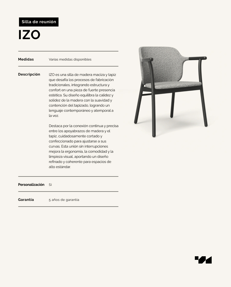 IZO es una silla de madera maciza y tapiz que desafía los procesos de fabricación tradicionales, integrando estructura y confort en una pieza de fuerte presencia estética. Su diseño equilibra la calidez y solidez de la madera con la suavidad y contención del tapizado, logrando un lenguaje contemporáneo y atemporal a la vez.Destaca por la conexión continua y precisa entre los apoyabrazos de madera y el tapiz, cuidadosamente cortado y confeccionado para ajustarse a sus curvas. Esta unión sin interrupciones mejora la ergonomía, la comodidad y la limpieza visual, aportando un diseño refinado y coherente para espacios de alto estándar.