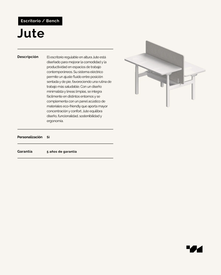 El escritorio regulable en altura Jute está diseñado para mejorar la comodidad y la productividad en espacios de trabajo contemporáneos. Su sistema eléctrico permite un ajuste fluido entre posición sentada y de pie, favoreciendo una rutina de trabajo más saludable. Con un diseño minimalista y líneas limpias, se integra fácilmente en distintos entornos y se complementa con un panel acústico de materiales eco-friendly que aporta mayor concentración y confort. Jute equilibra diseño, funcionalidad, sostenibilidad y ergonomía.