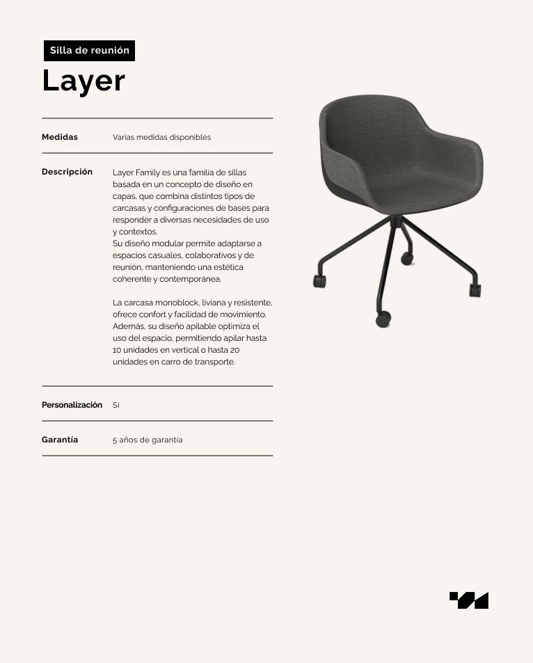 Layer Family es una familia de sillas basada en un concepto de diseño en capas, que combina distintos tipos de carcasas y configuraciones de bases para responder a diversas necesidades de uso y contextos. Su diseño modular permite adaptarse a espacios casuales, colaborativos y de reunión, manteniendo una estética coherente y contemporánea.La carcasa monoblock, liviana y resistente, ofrece confort y facilidad de movimiento. Además, su diseño apilable optimiza el uso del espacio, permitiendo apilar hasta 10 unidades en vertical o hasta 20 unidades en carro de transporte.