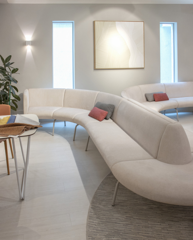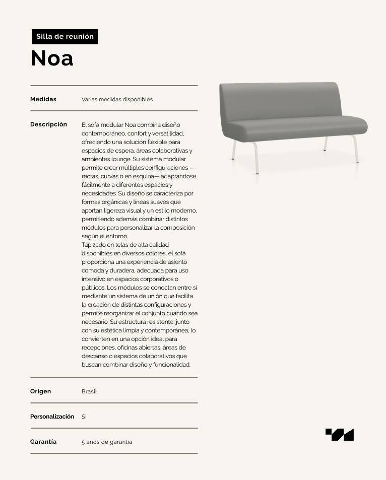 El sofá modular Noa combina diseño contemporáneo, confort y versatilidad, ofreciendo una solución flexible para espacios de espera, áreas colaborativas y ambientes lounge. Su sistema modular permite crear múltiples configuraciones —rectas, curvas o en esquina— adaptándose fácilmente a diferentes espacios y necesidades. Su diseño se caracteriza por formas orgánicas y líneas suaves que aportan ligereza visual y un estilo moderno, permitiendo además combinar distintos módulos para personalizar la composición según el entorno.Tapizado en telas de alta calidad disponibles en diversos colores, el sofá proporciona una experiencia de asiento cómoda y duradera, adecuada para uso intensivo en espacios corporativos o públicos. Los módulos se conectan entre sí mediante un sistema de unión que facilita la creación de distintas configuraciones y permite reorganizar el conjunto cuando sea necesario. Su estructura resistente, junto con su estética limpia y contemporánea, lo convierten en una opción ideal para recepciones, oficinas abiertas, áreas de descanso o espacios colaborativos que buscan combinar diseño y funcionalidad.