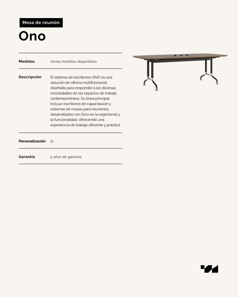 El sistema de escritorios ONO es una solución de oficina multifuncional, diseñada para responder a las diversas necesidades de los espacios de trabajo contemporáneos. Su línea principal incluye escritorios de capacitación y sistemas de mesas para reuniones, desarrollados con foco en la ergonomía y la funcionalidad, ofreciendo una experiencia de trabajo eficiente y práctica.