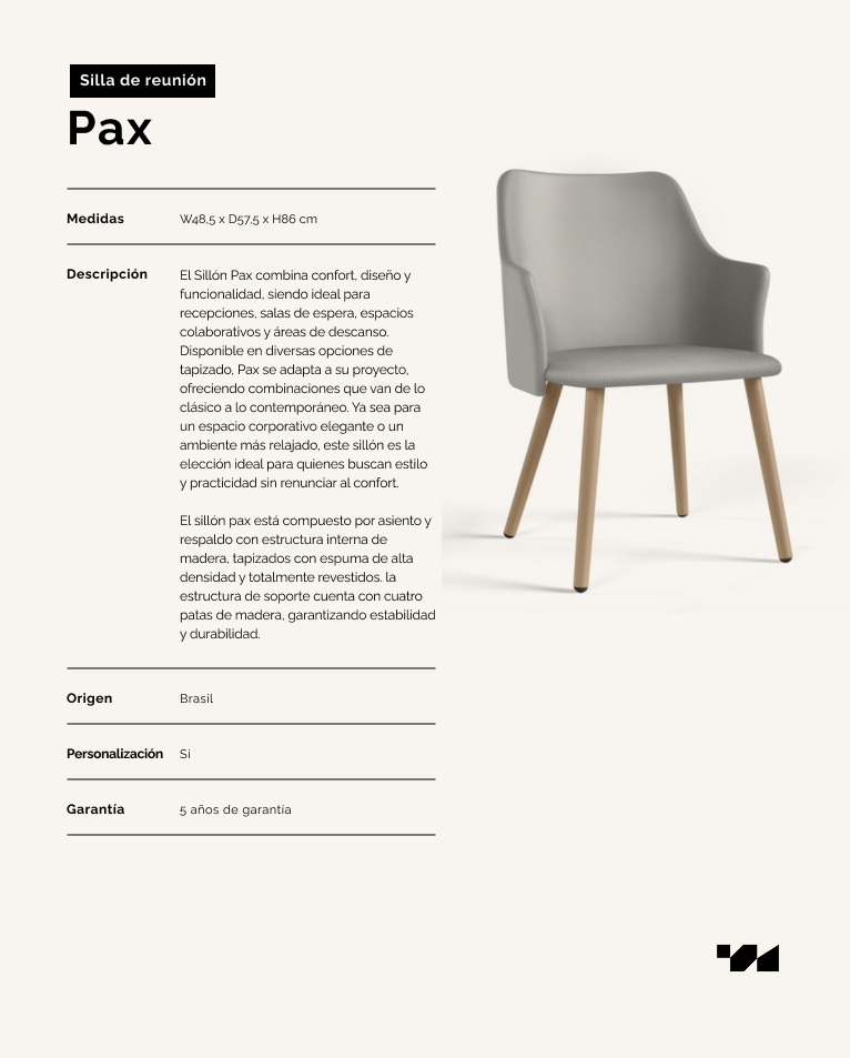 El Sillón Pax combina confort, diseño y funcionalidad, siendo ideal para recepciones, salas de espera, espacios colaborativos y áreas de descanso. Disponible en diversas opciones de tapizado, Pax se adapta a su proyecto, ofreciendo combinaciones que van de lo clásico a lo contemporáneo. Ya sea para un espacio corporativo elegante o un ambiente más relajado, este sillón es la elección ideal para quienes buscan estilo y practicidad sin renunciar al confort.El sillón pax está compuesto por asiento y respaldo con estructura interna de madera, tapizados con espuma de alta densidad y totalmente revestidos. la estructura de soporte cuenta con cuatro patas de madera, garantizando estabilidad y durabilidad.