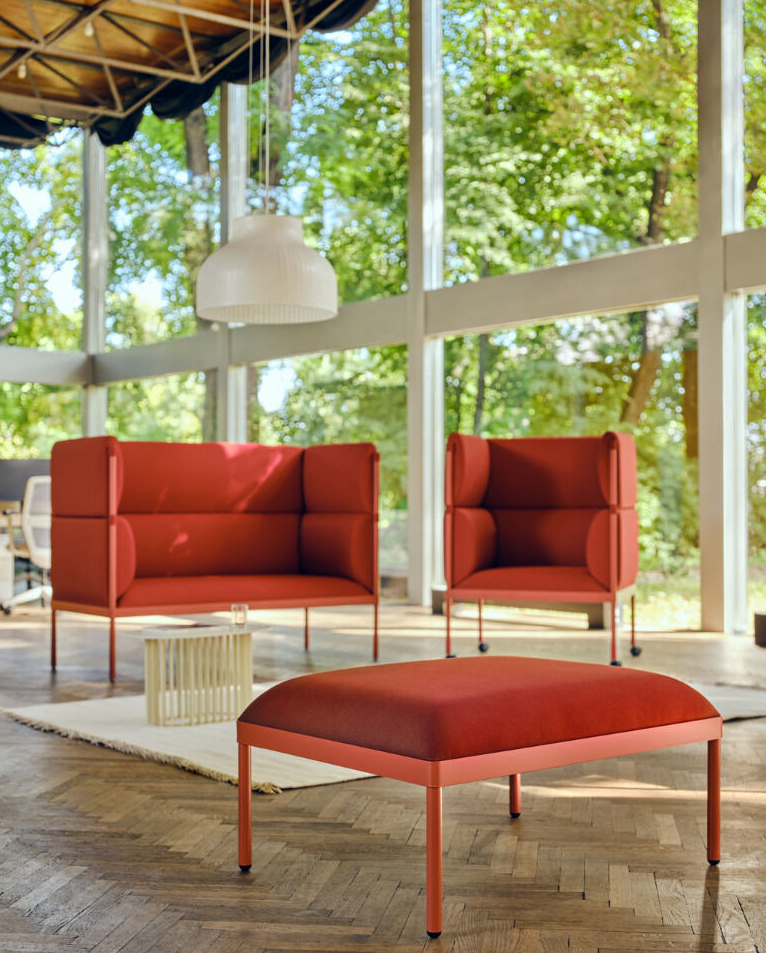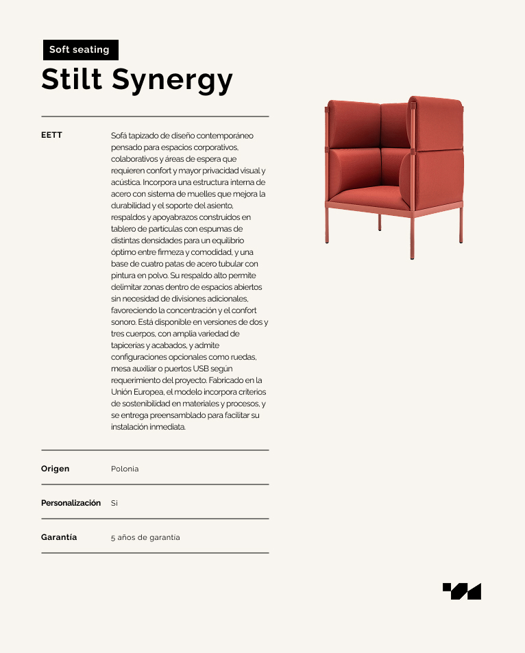 Sofá tapizado de diseño contemporáneo pensado para espacios corporativos, colaborativos y áreas de espera que requieren confort y mayor privacidad visual y acústica. Incorpora una estructura interna de acero con sistema de muelles que mejora la durabilidad y el soporte del asiento, respaldos y apoyabrazos construidos en tablero de partículas con espumas de distintas densidades para un equilibrio óptimo entre firmeza y comodidad, y una base de cuatro patas de acero tubular con pintura en polvo. Su respaldo alto permite delimitar zonas dentro de espacios abiertos sin necesidad de divisiones adicionales, favoreciendo la concentración y el confort sonoro. Está disponible en versiones de dos y tres cuerpos, con amplia variedad de tapicerías y acabados, y admite configuraciones opcionales como ruedas, mesa auxiliar o puertos USB según requerimiento del proyecto. Fabricado en la Unión Europea, el modelo incorpora criterios de sostenibilidad en materiales y procesos, y se entrega preensamblado para facilitar su instalación inmediata.