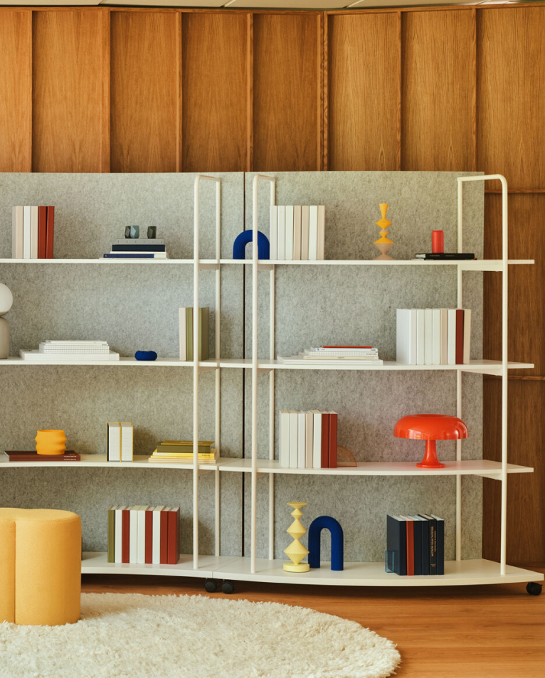 Su estructura liviana con ruedas permite reorganizar fácilmente el espacio y crear zonas semi-privadas de forma flexible. Incorpora paneles de PET que cierran visualmente los módulos y mejoran las condiciones acústicas del ambiente.